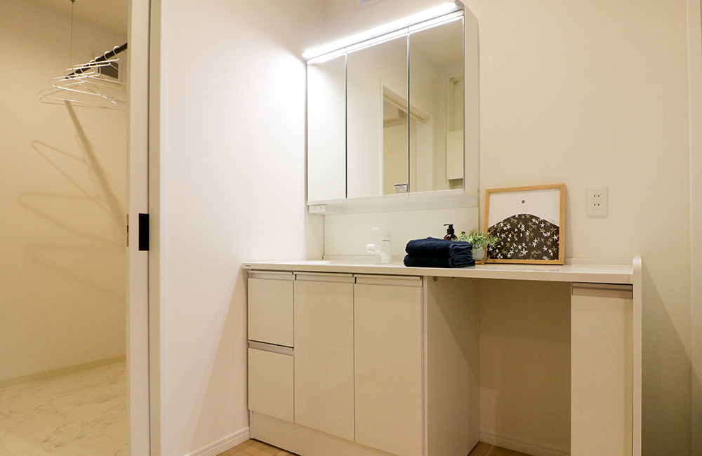 別々の人が同時に使えるように、洗面室と脱衣室を分けました。もし誰かが入浴中でも、出てくるのを待たずに、手洗いやハミガキ・洗顔など、洗面台を気兼ねなく使用できます。洗面台は2人並んで使えるため、混雑する朝の身支度もスムーズに。また、脱衣室には、雨の日や花粉の季節に便利な、室内物干しも設けています。タオル類などを、洗面室の埋め込み収納にしまえば、「洗う→干す→片づける」が一ヶ所で完結できます。