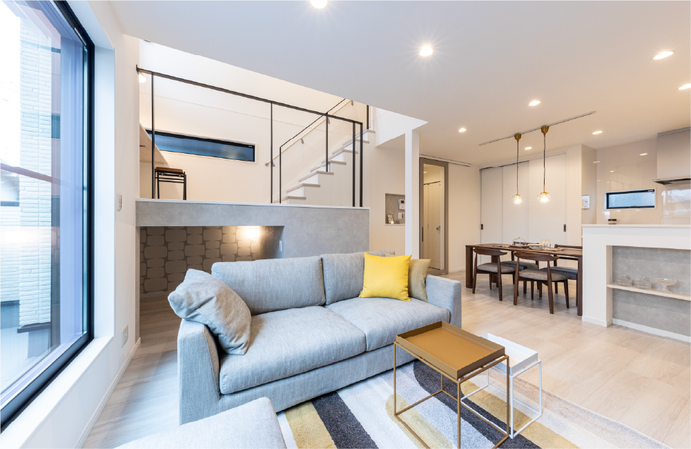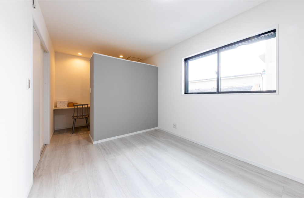 家族が集まる2階のLDKは、白を基調にした明るい空間。そのLDKからプライベートスペースである3階へと、スキップフロアでつながるオープンなつくりのお家です。2階から3階へ向かう途中の踊り場にはカウンターを設け、リビングで過ごす家族の気配を感じながら、子どもたちが集中して勉強できるスタディコーナーに。スキップフロアの下には、約2帖ほどの収納スペースを設け、子どもたちが秘密基地のように楽しめる遊び場としても活用できます。限られた空間の中でスキップフロアを採用することで、プラスアルファの空間を生み出し、住まいに広がりをもたらすと同時に、家族のコミュニケーションを豊かに育む住まいになりました。