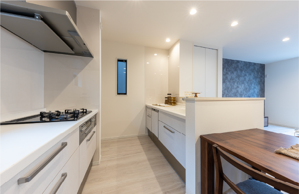 コンロとシンクを分けて2列に並べたⅡ型キッチンは、コンロからシンクへの移動も振り返るだけ。スペースが広くて作業分担もしやすいので、子どもも楽しくお料理のお手伝いができます。食器や家電、食品のストックなどは、すぐ横のパントリーにしっかり収納できます。
