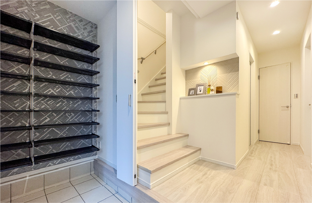 お客さまを気持ちよく迎えることができるよう、玄関横にシューズクローゼットを設けました。来客時に玄関が散らかっていても、サッと片付けて扉を閉めれば中を見られることもありません。玄関正面に設けたニッチには、お花やお気に入りの小物を飾って素敵な玄関を演出できます。