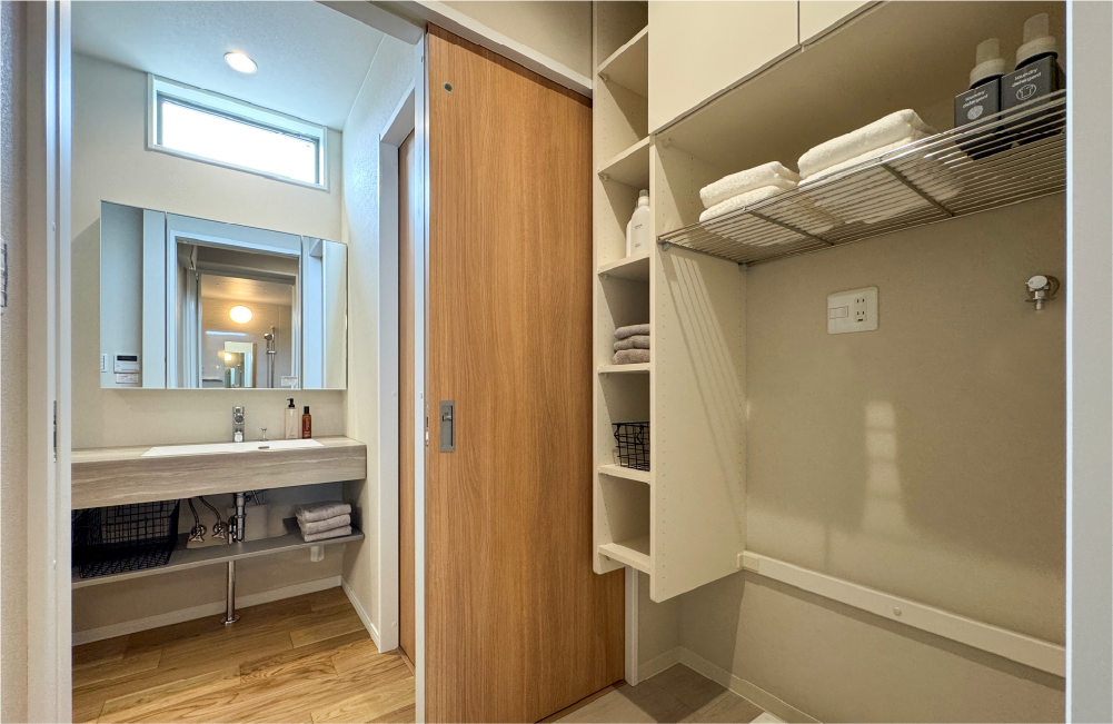 洗面化粧台をリビングの一角に配置。脱衣室と分離することで、入浴中の家族を気にせず利用できます。来客時も脱衣室を隠せるため、プライバシーに配慮しながら快適にご利用いただける設計です。