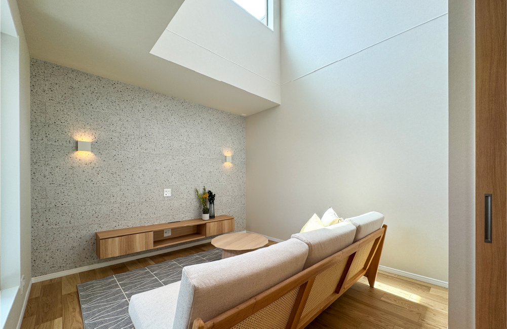3階の南向きの大きな窓から、心地よい陽光が注ぐ吹抜けリビング。縦方向に広がる空間が、くつろぎの場所を明るく開放的に演出します。吹抜けを介して3階の子どもたちとの会話も自然と生まれ、家族のコミュニケーションを育む空間となっています。