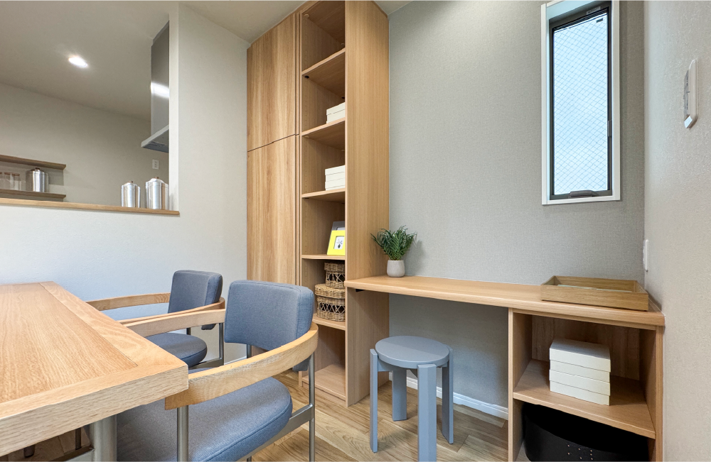 ダイニングの背面に、豊富な収納と造作カウンターを備えたスタディコーナーを配置。キッチンからお子様の学習姿勢を見守れる設計で、パソコンやプリンターを設置してワークスペースとしても活用できる多目的な空間です。