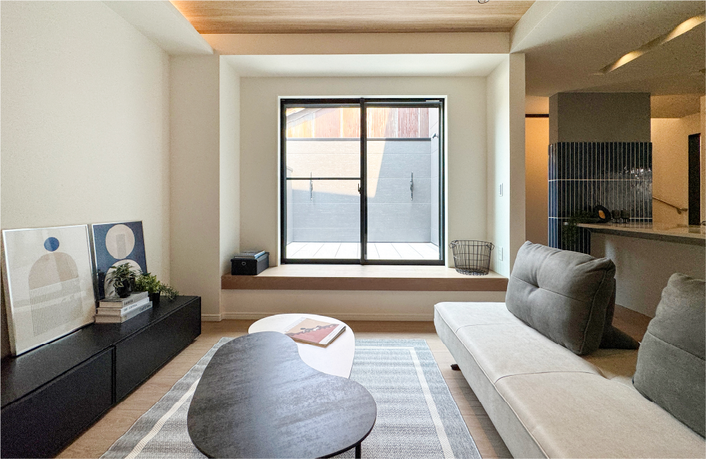 リビングには折り上げ天井を取り入れ、空間に広がりを持たせることで、開放的でのびやかな雰囲気を演出しました。リビングとバルコニーの間には、小上がりのヌックを設けています。心地よい光あふれる空間で、本を読んだり、のんびりと過ごしたり、リラックスした時間を楽しめるスペースです。