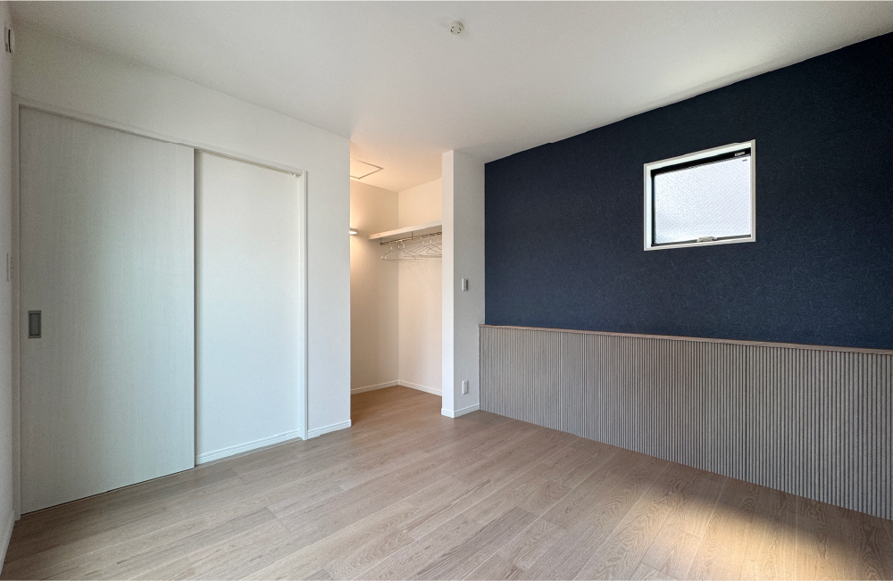 主寝室には造作のヘッドボードを取り入れ、ホテルのような洗練された雰囲気に仕上げました。ヘッドボードは、携帯電話やメガネ、本などを気軽に置けるスペースとして重宝します。扉のないウォークインクローゼットは、収納力をしっかり確保しながら、空間に広がりをもたらします。