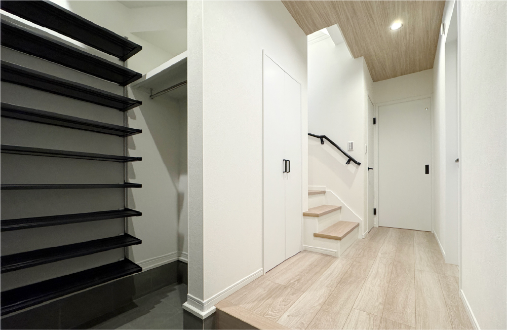 ご家族みんなの靴はもちろん、ベビーカーやゴルフバッグなど大きなアイテムも収納できるシューズクローゼット。汚れが気になるガーデニング用品やアウトドア用品の収納にも最適です。アウターも掛けられるため、急な外出時もスムーズに対応できます。