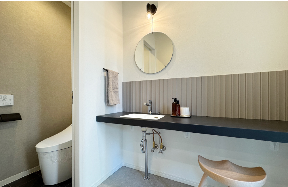 2階にもパウダールームを設置。洗面台が2ヶ所あることで、朝の混雑時もスムーズに身支度が整えられます。ワイドな造作カウンターは、アイロンがけや洗濯物たたみなどの家事スペースとしても活用できる実用的な設計です。