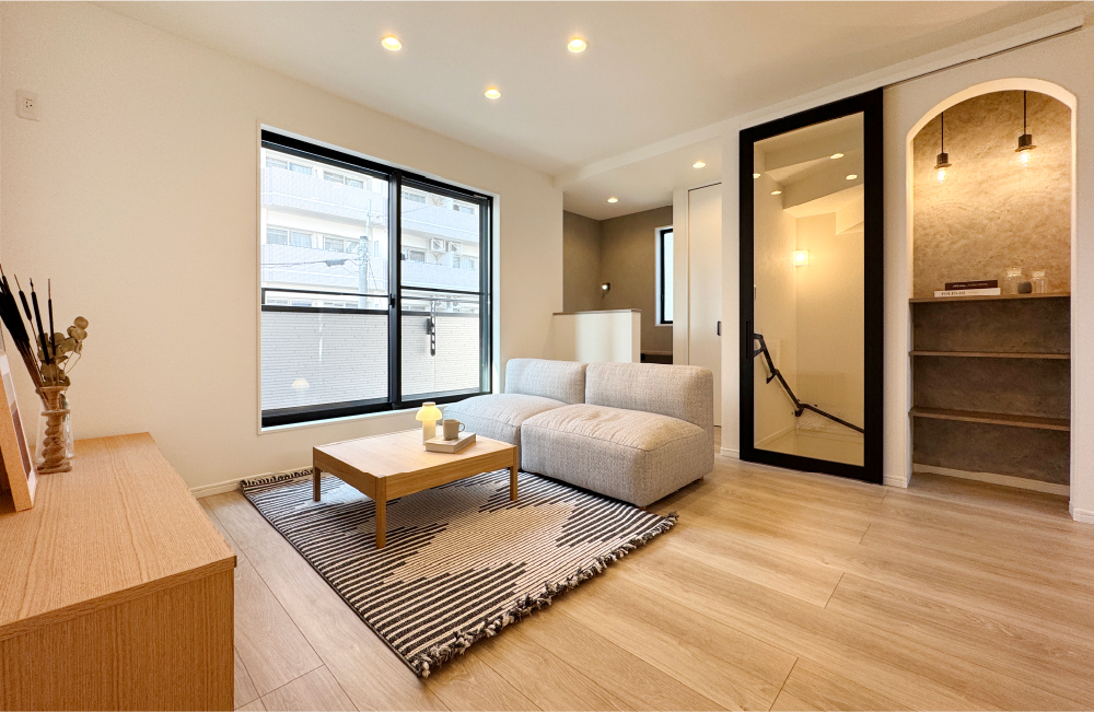 家族のつながりを大切にし、自然とコミュニケーションが育まれる住まいが完成します。家族が集まり、暮らしの中心となるリビングを2階に配置。陽光がたっぷり差し込む明るく開放的な空間となります。リビングの一角には、家族の会話や存在を感じながらも、集中して勉強や仕事ができる書斎スペースを設けました。さらに、リビング階段を採用することで、帰宅時や外出前の「おはよう」「いってきます」「ただいま」「おかえり」といった家族との自然な会話が生まれます。いつも家族の気配を感じながら、安心して過ごせる心地よい住まいです。