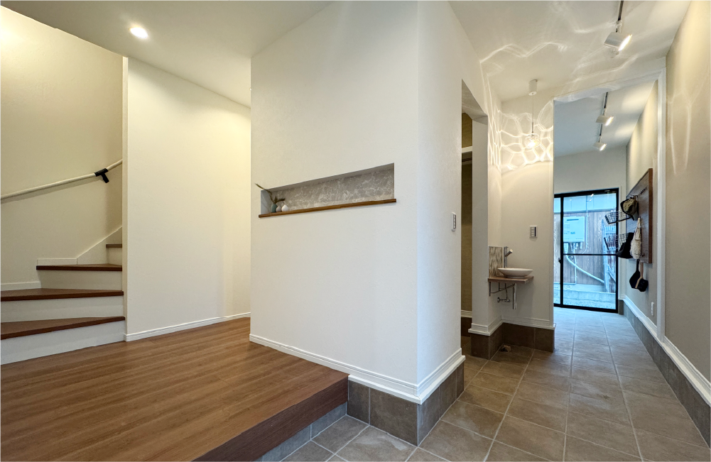 玄関は、シューズクローゼットを通る家族専用と来客用の便利な2way動線を採用。奥の広々とした土間スペースまでつながり、設置されたセカンド洗面台で帰宅時の手洗い・うがいはもちろん、家庭菜園やガーデニングの泥汚れもここで洗い流せるので、室内を清潔に保てます。