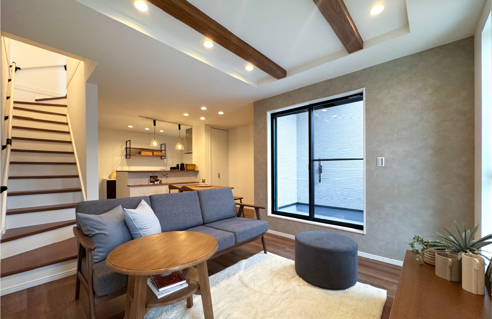 折り上げ天井が広がりのある空間を演出し、バルコニーからは心地よい光と風が注ぐ明るいリビング。家族との自然な出会いを生むリビング階段で、日々のコミュニケーションが深まり、豊かな暮らしを実現します。