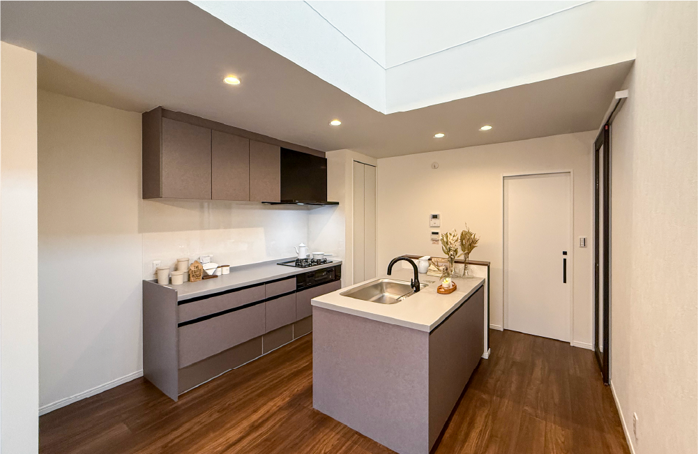 開放感あふれる吹抜けダイニングと、家族それぞれのプライバシーを大切にした家が誕生します。家族が集う2階LDKは、明るい光が降り注ぐ吹抜けが開放感を演出し、自然と会話が弾む空間です。セパレートタイプのⅡ型キッチンは、ダイニングと横並びで料理や配膳もスムーズに行えます。さらに、水廻りが同じフロアにまとまっているため、料理や洗濯などの家事動線も効率的です。1階には、シューズクローゼット付きの2way玄関を設置。靴以外にも多くのものを収納でき、玄関はいつも整頓された状態を保てます。1階のサービスルームにはウォークインクローゼットを完備し、快適なプライベート空間を実現します。3階には、吹抜けを挟んで2つの洋室を配置。それぞれのプライベートをしっかりと確保しながらも、吹抜けを通して家族の気配を感じられる、程よい距離感を保てる設計です。家族のふれあいを育む開放的なリビングと、個々の時間を大切にするプライベート空間。どちらも両立させた理想の住まいです。