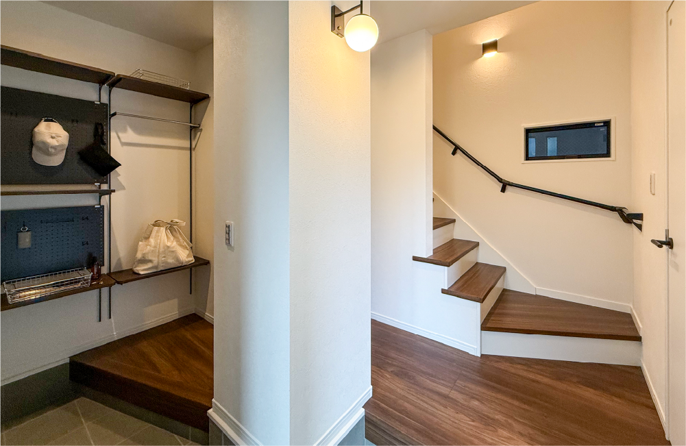 玄関の奥に大型のシューズクローゼットを設けました。ガーデニング用品やアウトドア用品など、少し汚れが気になるものをしっかりと収納できます。シューズクローゼットは家族用の玄関も兼ねていて、メインの玄関はスッキリと片付きお客様を気持ちよく迎えられます。