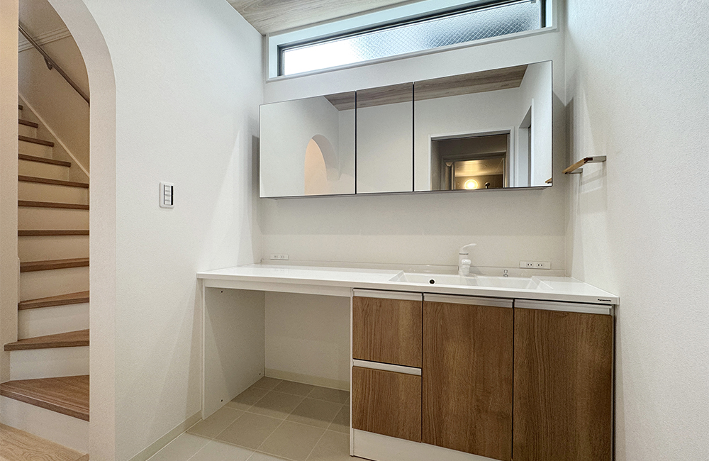 2人並んでゆったり使える幅1700mmのカウンターに、背面にはオーラルケア用品やスキンケア用品をスッキリと収納できるワイドミラーを設置した、使いやすい洗面室です。ランドリールームと分かれているので、家族が入浴中でも気兼ねなく洗面台をご利用いただけます。