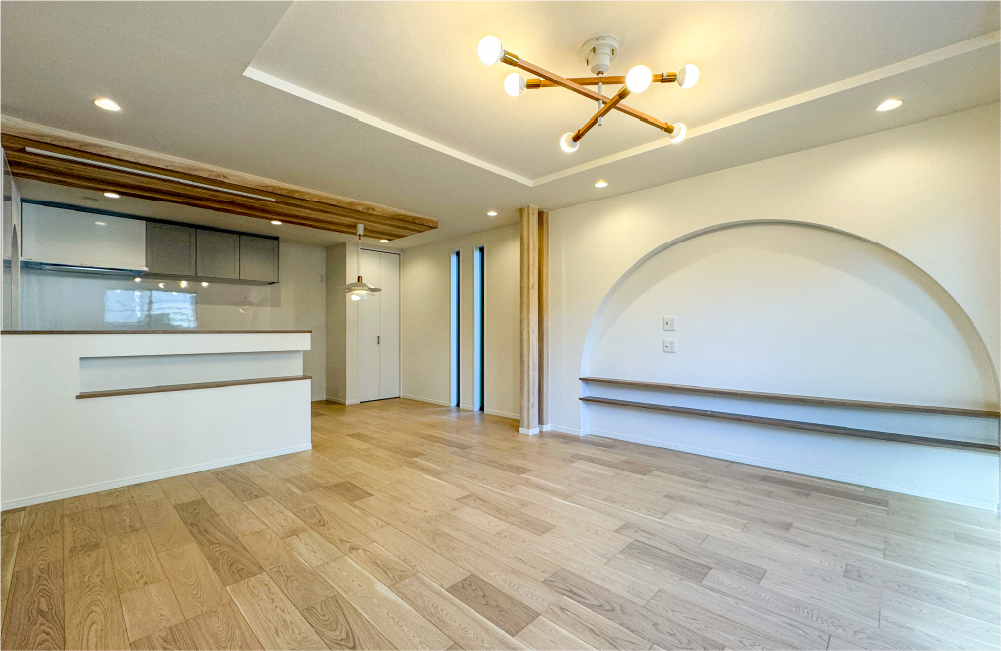 心地よい陽光がたっぷり降り注ぐ南向きのリビングは、折り上げ天井を採用することでさらに開放感を感じられる空間にしました。アーチ型のニッチは壁掛けテレビの設置ができるだけでなく、デザイン性のあるアクセントにもなる使いやすさとスタイリッシュさを両立したリビングです。