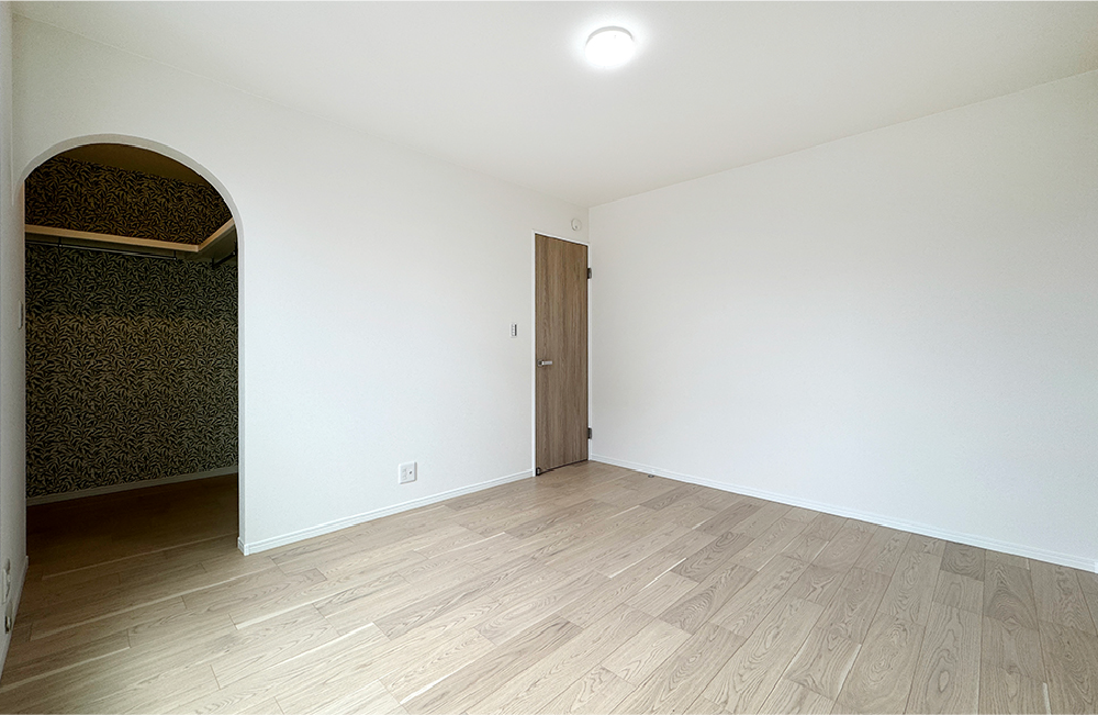 朝の陽ざしが心地よい南向きの主寝室には、アーチ型のかわいい入り口が特徴のウォークインクローゼットをご用意しました。洋服選びが楽しくなるデザインで、衣類だけでなく季節家電や布団などの大きな荷物もしっかり収納可能。お部屋を広々と快適にお使いいただけます。