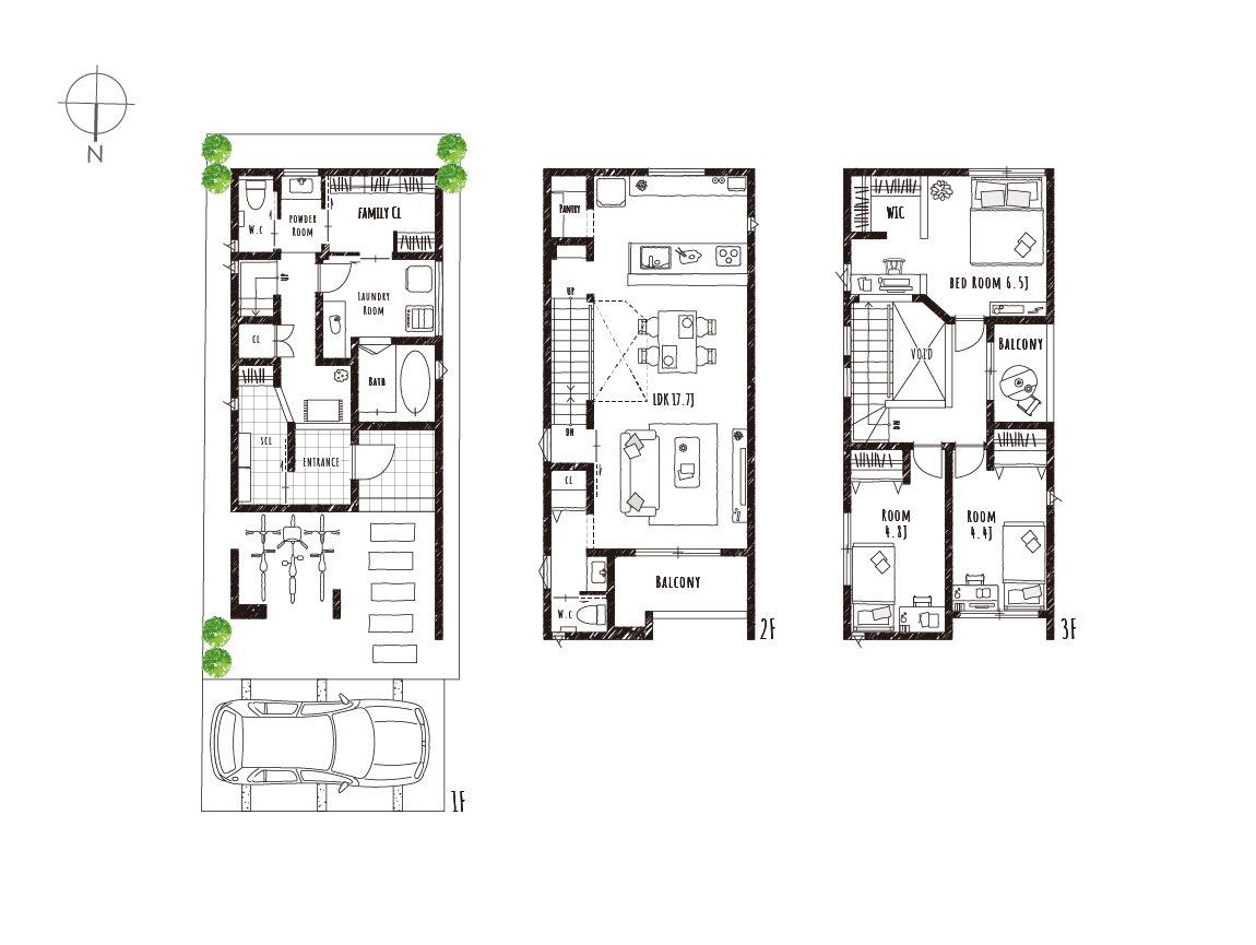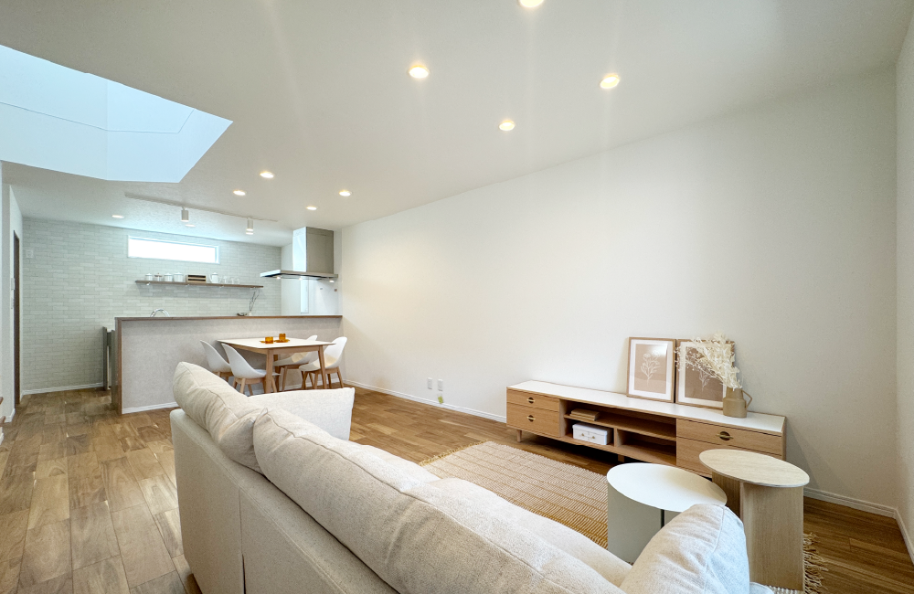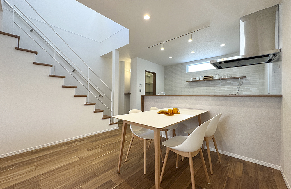 家族の時間を大切にしながら、家事も気持ちよくこなせる、やさしさに包まれたお家です。リビングはインナーバルコニーに面した、やわらかな光が差し込む心地よい空間。自然と家族が集まり、くつろげる場所になっています。リビング階段を取り入れているので、顔を合わせる機会も増え、毎日にあたたかな会話が生まれます。キッチンはLDK全体が見渡せる対面式で、隣には便利なパントリー付き。ランドリールームは洗面室と分かれており、造作カウンターでたたむ・アイロンがけなどの作業も快適。さらに隣接するファミリークローゼットで、収納までがスムーズにつながります。家族との時間を大切にしながら、毎日の家事も気持ちよくこなせる、やさしい住まいです。