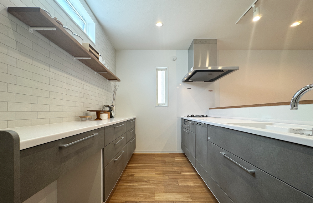 リビングやダイニングでくつろぐ家族の様子を見守りながら、楽しく料理ができる対面キッチン。すぐ隣のパントリーには、食材や日用品をたっぷり収納でき、必要なものがすぐに取り出せて、とても便利です。家族との会話を楽しみながら、毎日の暮らしがもっと快適になるキッチンです。