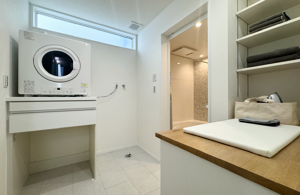 洗面室と分けることで、使いやすさにこだわったランドリールームをつくりました。造作のカウンターを設置しているので、乾いた洗濯物をその場でたたんだり、アイロンがけもできます。さらに、すぐ隣にはファミリークローゼットがあるので、畳んだ洗濯物の収納もスムーズです。