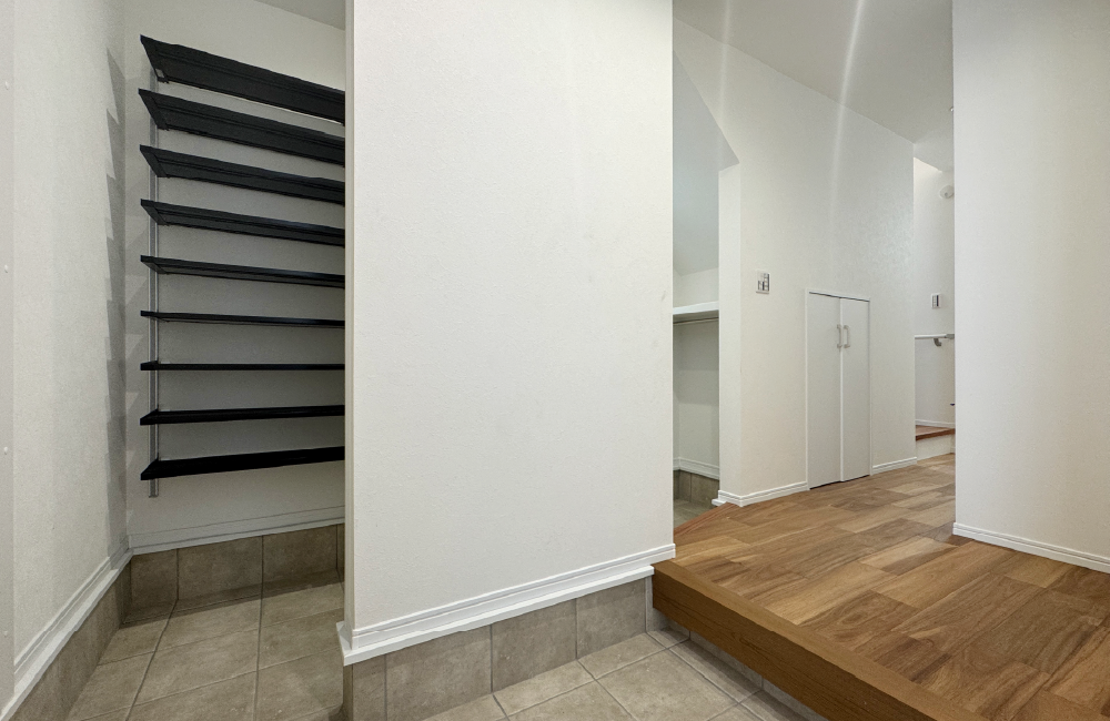 家族用と来客用で分けられる2WAY仕様の玄関。家族用は広々としたシューズクローゼットを兼ねていて、靴はもちろん、キャンプ用品や外遊び用のおもちゃなどもしっかり収納できます。ハンガーパイプも付いているので、アウターをかけておけばお出かけ前にサッと羽織ることができます。