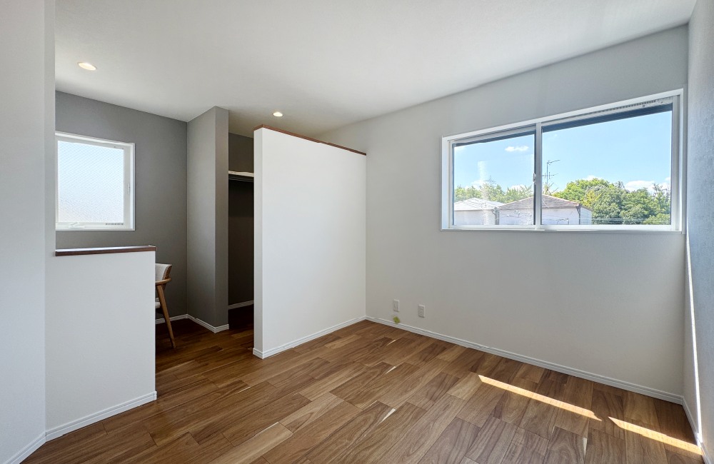 主寝室には、ウォークインクローゼットを設置。洋服はもちろん、スーツケースや季節家電などの大きなものもすっきり収納できます。隣には、メイクやワークスペースとして使える造作カウンターを設置。腰壁でほどよく仕切られているので、落ち着いて作業や身支度ができる快適な空間です。