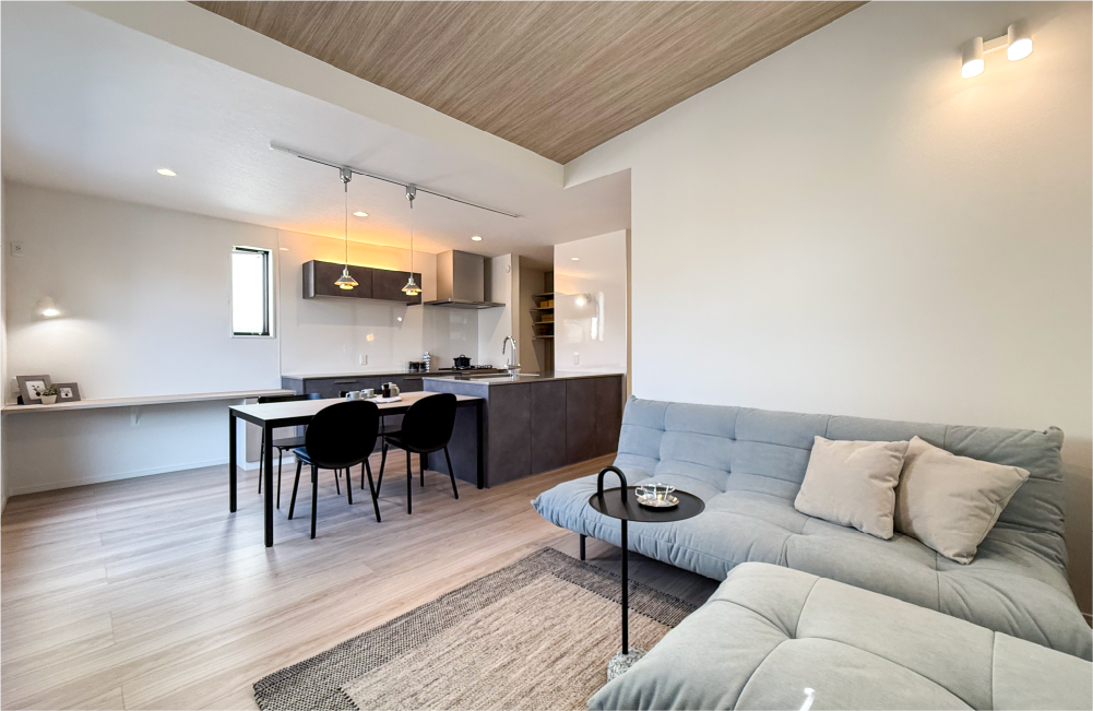 勾配天井を採用したリビングは、最大約2.9mの天井高があり、開放感たっぷり。のびやかな空間が、家族みんなのくつろぎの時間をより心地よいものにしてくれます。さらに、テレビ上部には折り下げ天井を取り入れ、間接照明のやわらかな光が家族団らんの空間を優しく彩ります。
