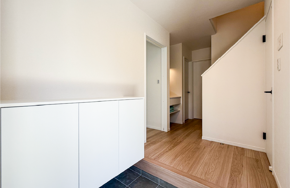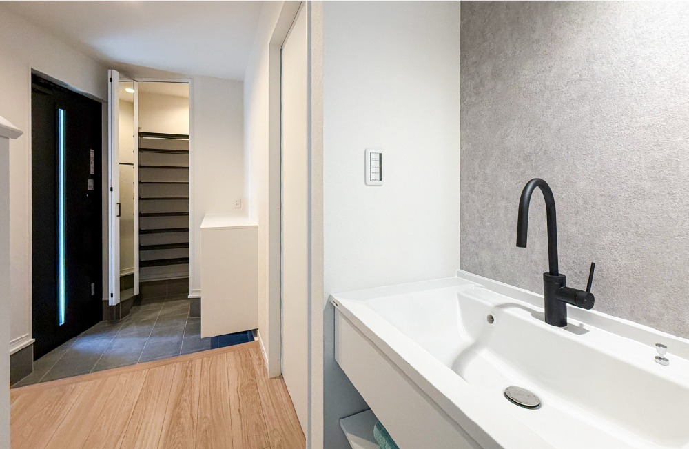 玄関を入ってすぐの場所にセカンド洗面を設置し、帰宅後すぐに手洗いやうがいができるようにしました。玄関ホールにあるため、お客様も気軽に利用できます。さらに、主寝室からも近く、寝る前や身支度の際にわざわざ2階へ行く手間が省けるため、より便利に使えます。