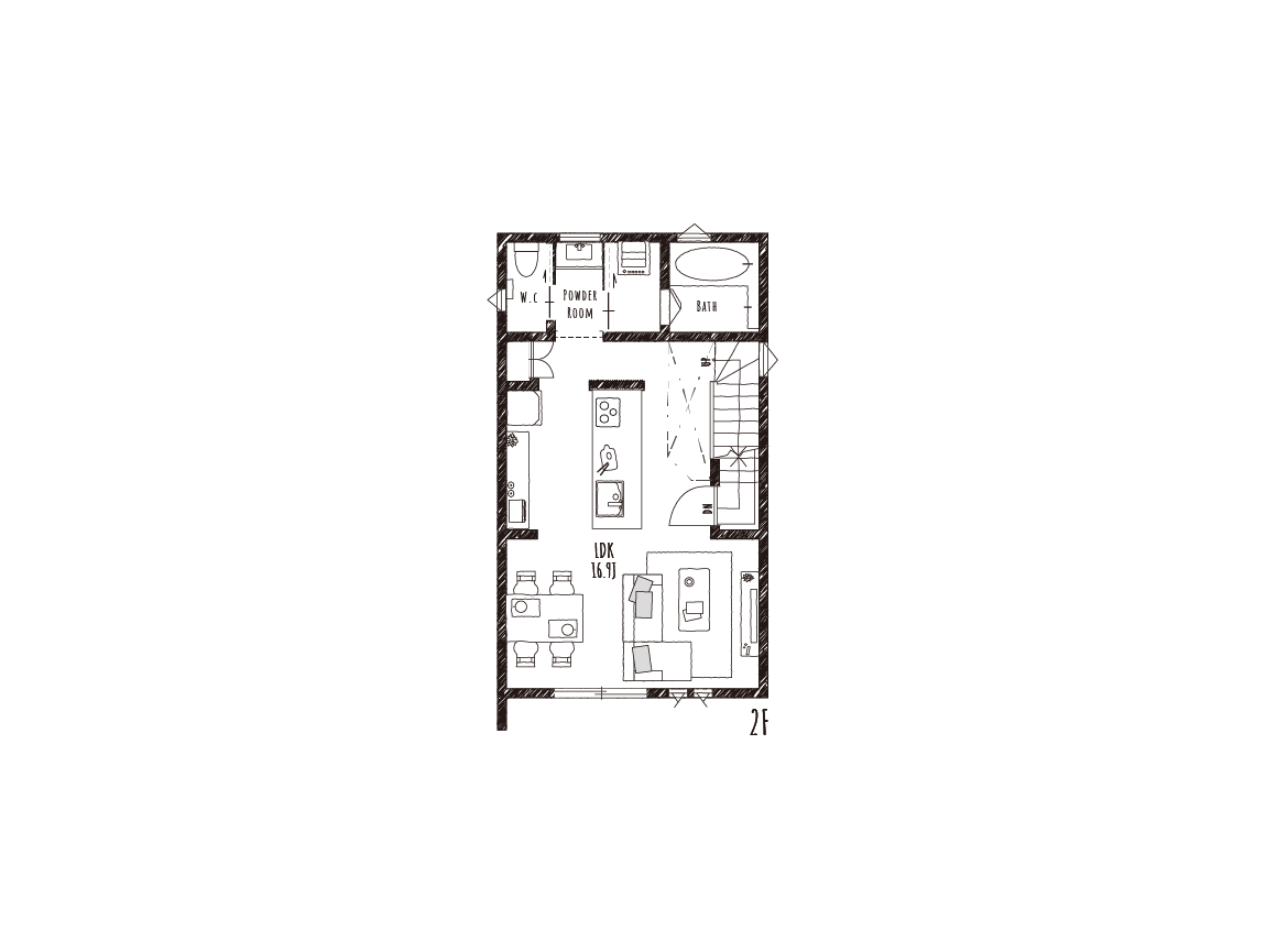 キッチンを中心に、家族のふれあいを育むあたたかなお家です。家の真ん中には、ぐるりと回遊できるペニンシュラキッチンを配置。料理をしながら、すぐそばのリビングやダイニングでくつろぐ家族の様子を見守れる、つながりを感じる空間が広がります。キッチンの前には、アイアン手すりが印象的な吹抜け階段があり、上から柔らかな光が差し込む開放的な雰囲気を演出。また、すぐ横には洗面室と脱衣室をセパレートして配置し、家族の誰かが入浴中でも洗面台が使えるよう、使い勝手に配慮しました。3階には、洗濯物をたくさん干せるワイドなバルコニーと、天候を気にせず洗濯ができるランドリースペースを完備。暮らしやすさとデザイン性を兼ね備えた、心地よい住まいです。