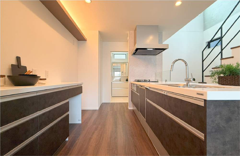 家の中心にある、使い勝手の良いペニンシュラキッチン。ぐるっと回れる動線で、家事もスムーズに。目の前にはアイアン手すりを設置した吹抜け階段があり、開放感もたっぷり。LDK全体を見渡せるので、リビングで遊ぶお子さまの様子を見守りながら、安心してお料理ができます。