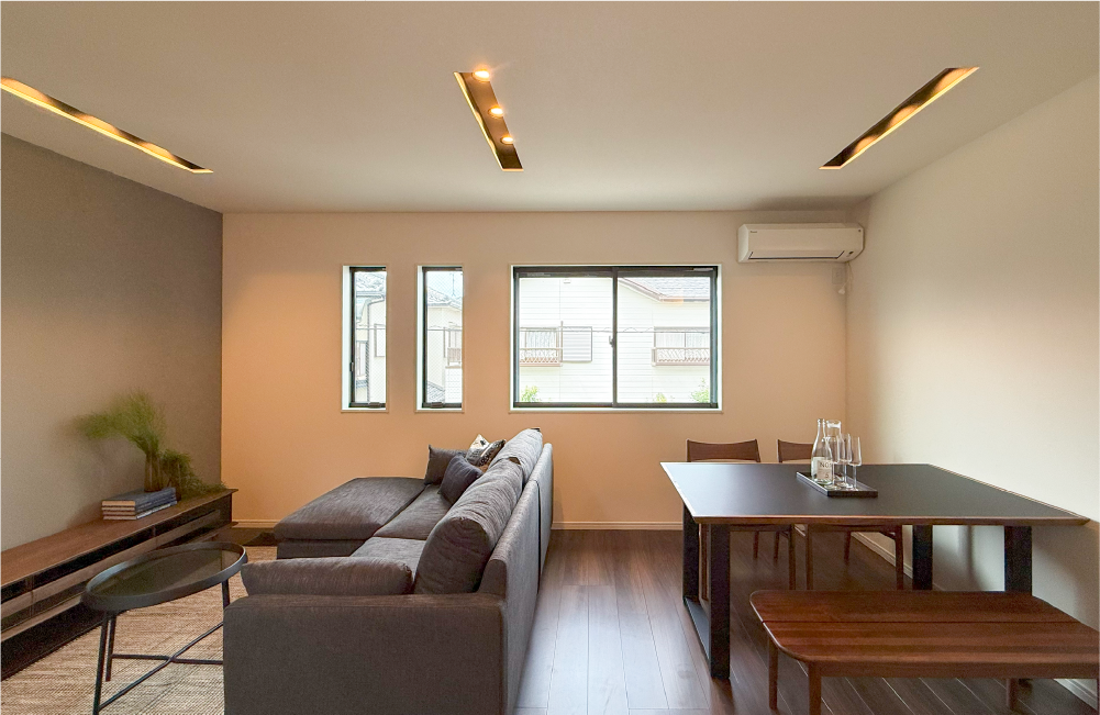 キッチンの横にワイドに広がるリビング・ダイニングは、家族みんながゆったりくつろげる心地よい空間。窓から差し込むたっぷりの自然光が、お部屋全体を明るく包み込みます。天井のスリットボックスにおさめたダウンライトは、スッキリとした美しさを演出し、さらに開放感を高めます。