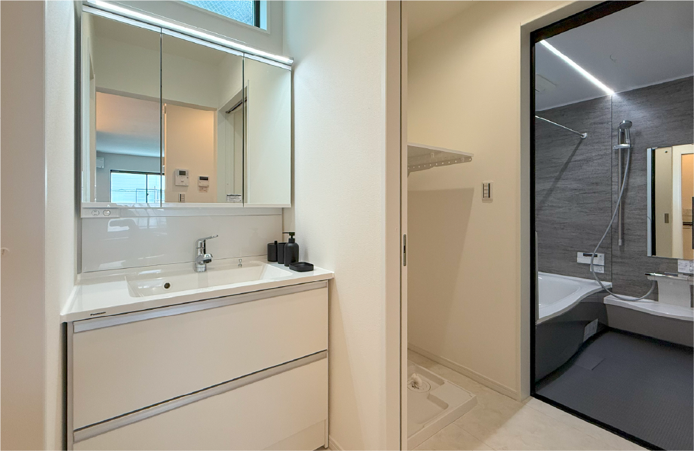 家族の誰かが入浴中でも気兼ねなく洗面台を使えるよう、洗面室と脱衣室をセパレートにしました。また、キッチンのすぐ隣にあるので、料理の合間に洗濯機を回したりと、家事をスムーズにこなすことができます。家事動線に配慮したプランニングで、毎日の暮らしを快適にします。