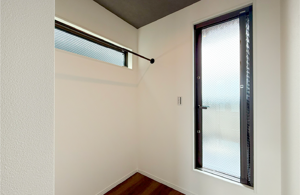 3階の階段を上がってすぐ、間口いっぱいに広がるワイドなバルコニー。たっぷりの洗濯物もゆったり干せる、うれしいスペースです。さらに、バルコニーの手前には室内ランドリースペースも設けました。天気を気にせず洗濯ができ、急な雨でもサッと取り込んでそのまま干せて、とても便利です。