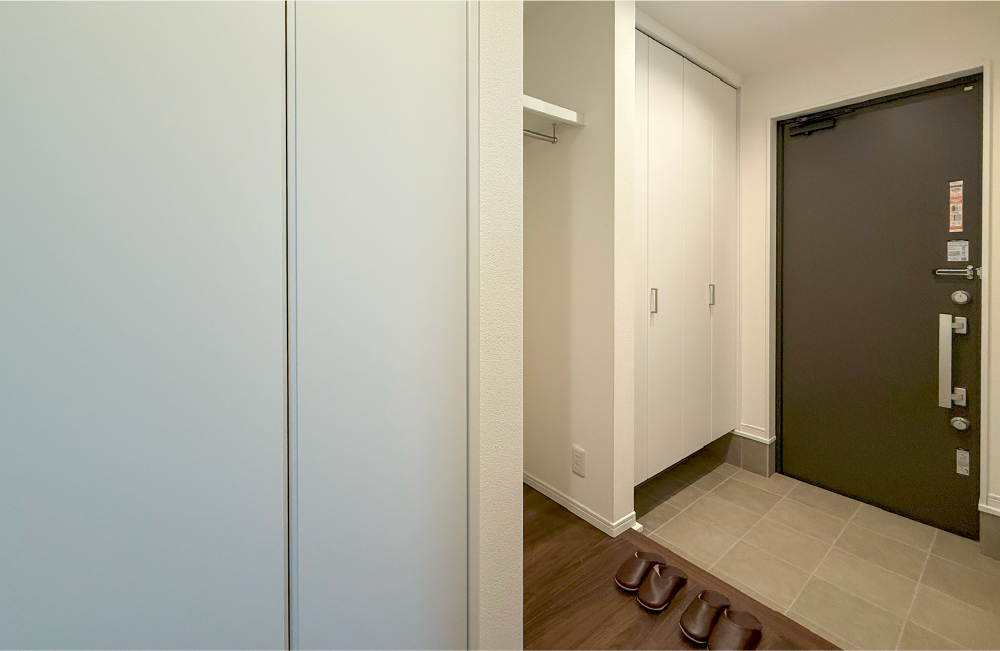 玄関には、家族全員の靴をスッキリ収納できるトールタイプのシューズボックスを設置しました。さらに、コートやジャケットを掛けられるハンガーパイプを備えているため、お出かけ時の動線もスムーズです。また、掃除道具などをしまえる収納もあるので、いつでも整った玄関を保てます。