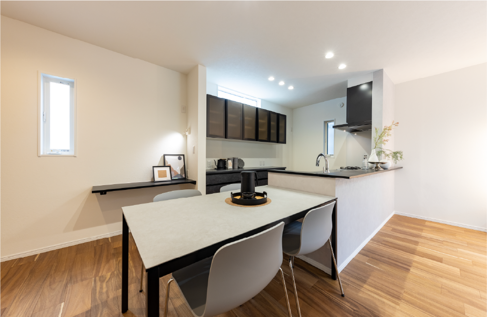 ダイニングとキッチンが横並びだから、料理の配膳も後片付けもスムーズ。キッチン横のカウンターは、家事コーナーとして使えるほか、お料理の合間にひと息つく場所にもぴったりです。さらに、キッチンからはリビングやダイニングが見渡せるので、家事をしながらでも家族の笑顔を感じられます。