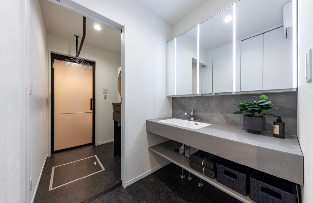 洗面室と脱衣室を分けているので、誰かがお風呂に入っていても気兼ねなく洗面台が使えて、ストレスがありません。脱衣室には室内物干しやガス衣類乾燥機「乾太くん」を設置しているので、夜遅くに洗濯したい時や雨の日の洗濯にも心強い味方です。毎日の家事がぐっとラクになります。