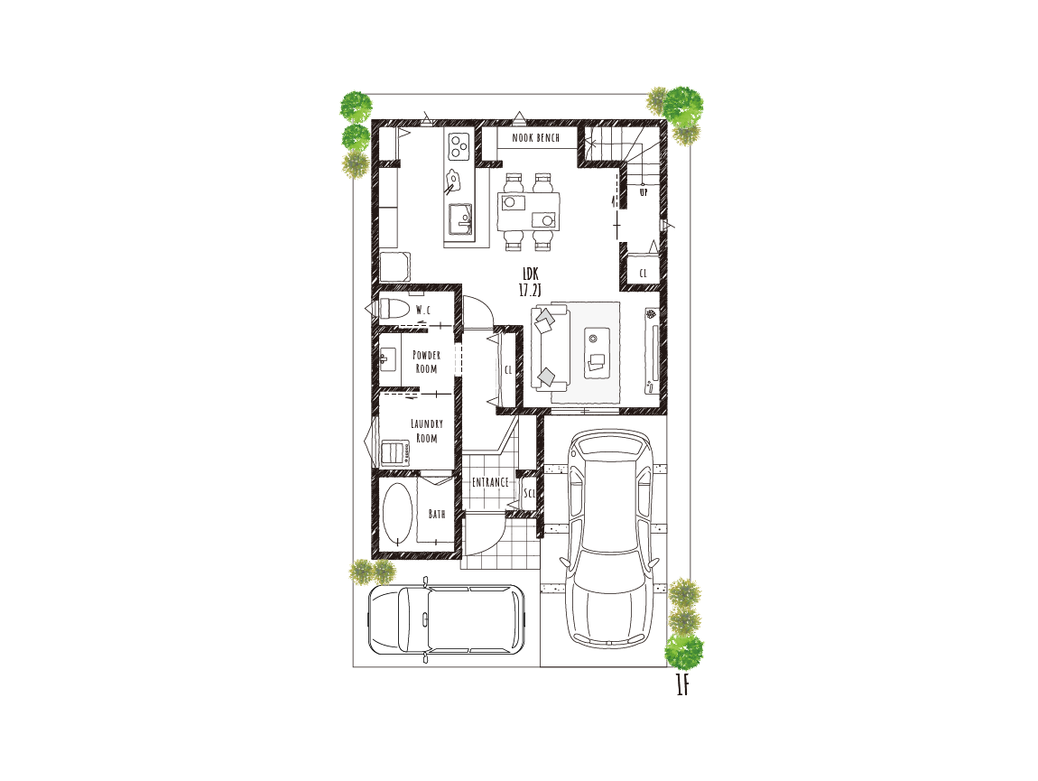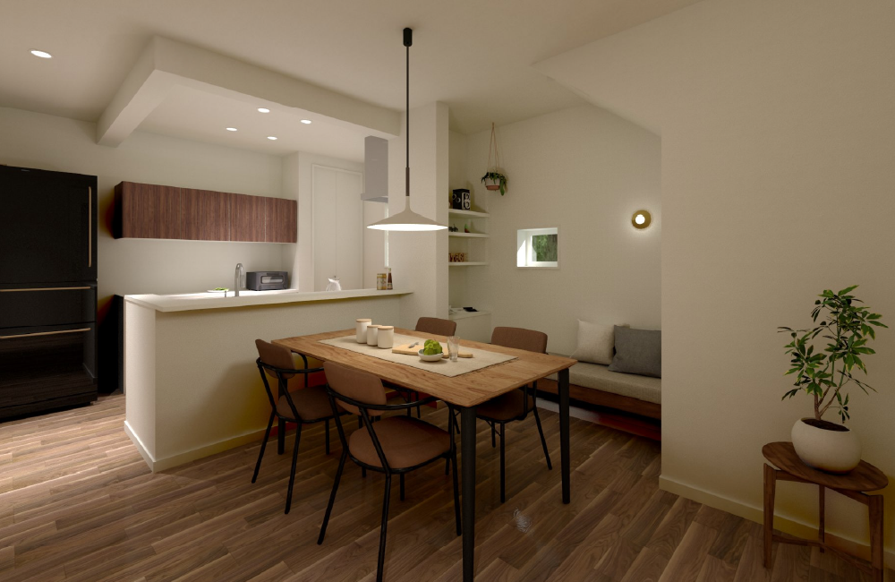 ほっと一息つけるヌックのある、ゆったりと落ち着ける空間が魅力のお家です。ダイニングのすぐ隣に設けられたヌックは、小さな隠れ家のような心安らぐ場所。カウンターや収納も備えているため、読書を楽しんだり、趣味に没頭したりと、自分だけの時間を豊かに過ごせます。リビングは、ダイニングやキッチンと少し距離をとって配置することで、より静かでくつろげる空間に仕上げました。家族と一緒に過ごす時間を楽しみながらも、ふと一人になりたいときに、そっとこもれる場所があるのは嬉しいポイントです。この住まいは、「家族とのあたたかな時間」と「一人で過ごす穏やかなひととき」、そのどちらも大切にできる設計となっています。日々の暮らしに、やさしい居心地と心地よい距離感をもたらしてくれる住まいです。