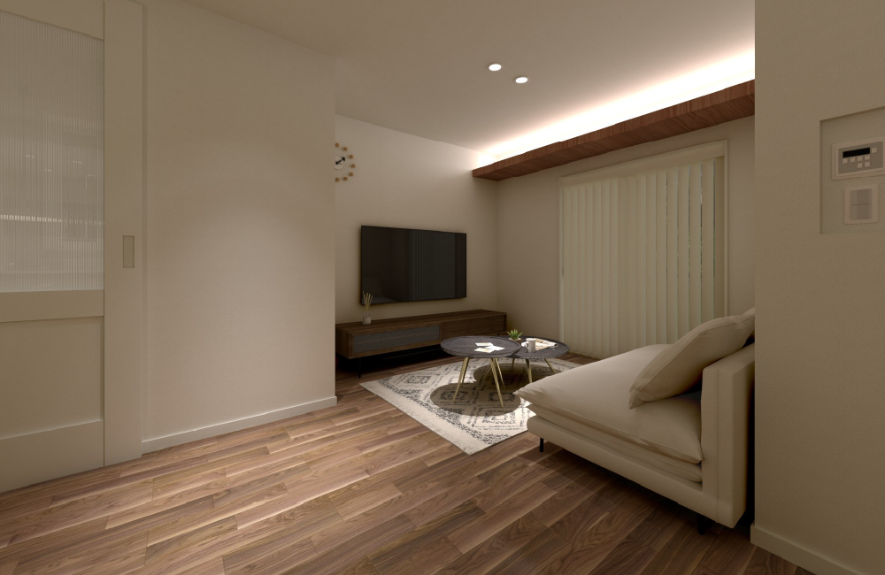 ダイニング・キッチンから少し離して配置されたリビングは、空間をゆるやかに分けることで、ほどよい独立感があります。天井の一部に間接照明を仕込んでいるので、夜にはやわらかな光が広がり、お部屋全体をやさしく包み込みます。家族で過ごす時間を、心地よいひとときにしてくれる空間です。