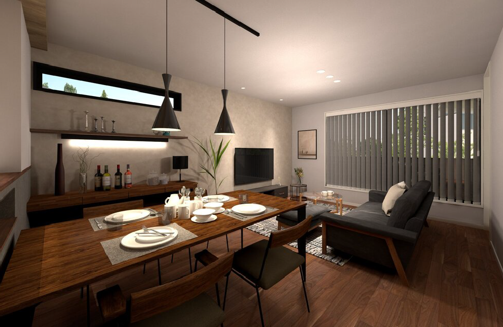 リビングには大きな掃き出し窓があって、やさしい光がたっぷり差し込む心地よい空間に。リビングとダイニングが横並びだから、自然と会話が広がります。ダイニングの横には、ワークスペースやスタディコーナー、夜はバーカウンターとしても楽しめるワイドなカウンターを設置しました。