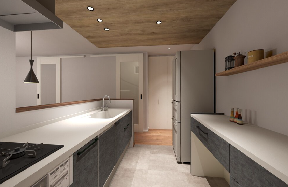 折り下げ天井で空間をやさしく分けたキッチンでは、お料理にしっかり集中できます。カウンタータイプのカップボードや、上部に設けた棚には、お気に入りの器やおしゃれなキッチン家電をディスプレイして「見せる収納」を楽しめます。隣には、食材のストックに便利なパントリーもご用意しました。