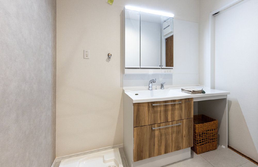 洗面・脱衣室には、室内干しをする時に便利なホスクリーンを設置しているので、雨の日や夜遅くの洗濯も安心です。洗面台は幅1,700mmとワイドカウンターを採用しているので、朝の支度は2人並んでもゆったり行えます。洗剤のストックやタオルの収納にぴったりな可動棚も設けました。