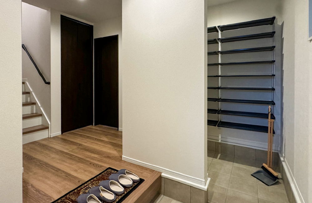 玄関にはお子さまの外遊び用のおもちゃやガーデニング用品の収納に便利な、土間続きのシューズクローゼットを設けました。このシューズクローゼットは、家族用の玄関としても使える2WAY仕様になっていて、来客用の玄関と分けることで、スッキリとした空間でお客様を迎えらることができます。