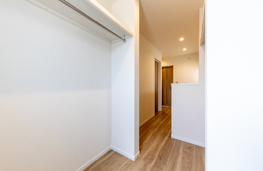 大きなファミリークローゼットが3階の共用スペースにあるので、子どもたちの洋服をわざわざ各部屋へ運ぶ手間もなくなり、家事の時短にもつながります。普段よく使うものは各部屋に、季節モノや使用頻度の少ないものはファミリークローゼットに、と使い分けできるのも便利なポイントです。