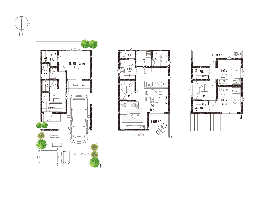 毎日の家事も暮らしも、心地よく過ごせる工夫が詰まったお家です。ダイニングの隣にはワイドなキャビネットを設置しました。一部がカウンター仕様で、スタディコーナーや在宅ワーク用デスクなど多彩に活用できます。リビングはダイニングから少し奥に配置され、家族の気配を感じながら落ち着いてくつろげる空間に。上部は勾配天井で広がりある開放感を楽しめます。さらに、キッチンを中心にパウダールームとランドリールームを分けて設けることで、水廻りの動線をスムーズに。同じフロアにバルコニーもあり、洗濯物を外に干すのもスムーズ。1階と3階にはそれぞれウォークインクローゼットを備え、たっぷりの収納力でお部屋はいつもスッキリ片付きます。家事のしやすさとくつろぎを両立した、家族思いの住まいです。