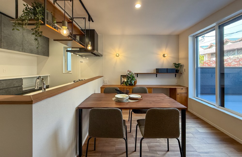 バルコニーに面したダイニングは、やわらかな光と風を感じながら、食事を楽しめる心地よい空間です。隣には一部をカウンター仕様にしたキャビネットを設け、空間をスッキリ片付けられるだけでなく、お子さまが家族の気配を感じながら集中して勉強できるスタディコーナーとしても活用できます。