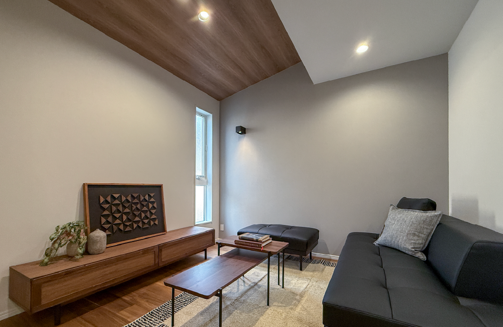 勾配天井を取り入れたリビングは、ソファに座ったときに上へと広がりを感じられる、開放感いっぱいの空間です。ダイニングとは少しずらして奥に配置しているので、家族で同じ時間を過ごしながらも、ほどよい独立感があります。のびやかさと落ち着きをあわせ持つ、居心地のよいリビングです。
