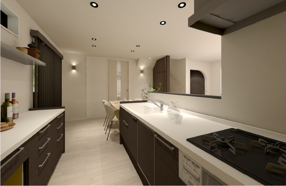 ダイニングと横並びのため、配膳も後片付けもひと続きでできる使いやすいレイアウトです。リビングやダイニングを見渡せるので、家族とのつながりを感じながら料理ができます。背面にはカウンタータイプのカップボードと上部に棚を設け、お気に入りの食器や調理家電を「見せる収納」で楽しめます。