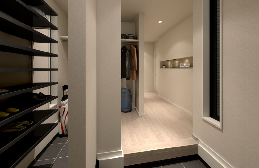 玄関を入ると左手に、家族用の玄関も兼ねたシューズクローゼットがあります。玄関ホールにはアウターをかけておけるハンガーパイプもあり、お出かけ前の準備も快適です。玄関をあがった廊下には、ダウンライトを備えたニッチがあり、やわらかな光が空間にほどよいアクセントを演出します。