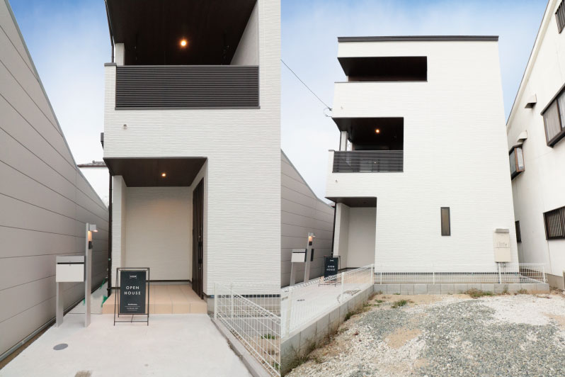 旗竿地って奥まっていて、何だか暗そう…。そんなイメージがガラッと変わるお家がここにあります。家族が集まる2階にLDKをL字型に配置し、南と東からの採光を確保。キッチン横には勝手口を設け、明るく使い勝手の良い仕様になっています。専用通路部分に駐車ができるからこそ、1階に8帖の居室や広めの水廻り、大きなシューズクロークまで配置することができました。収納をたっぷり確保しつつ、シンプルな色合いでまとめた、家族みんなが笑顔になる明るいお家です。