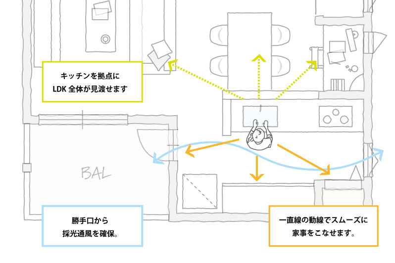 キッチン横に配置することで、料理や洗い物などの家事をしながらほどよく子供の様子が見え、「お母さん、ちょっとこれ教えて」にも答えることができます。