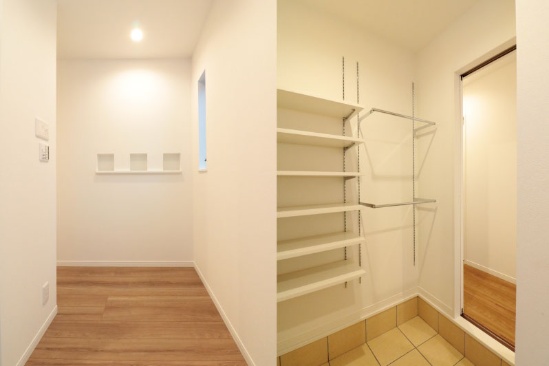 玄関を入ってすぐ目に入る3つのかわいいニッチには、お気に入りのインテリアを飾って。メインの玄関をスッキリと維持できるように、シューズクローク内にファミリー玄関を配置しました。