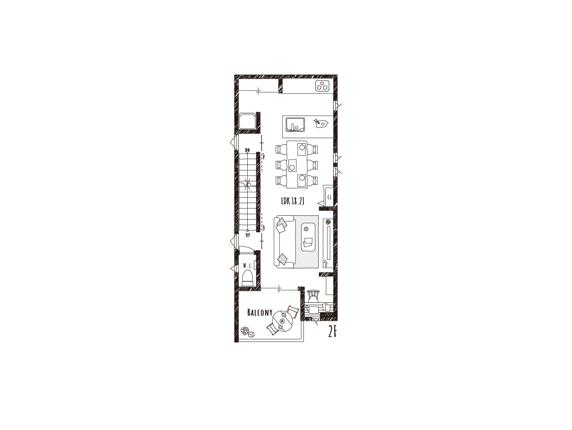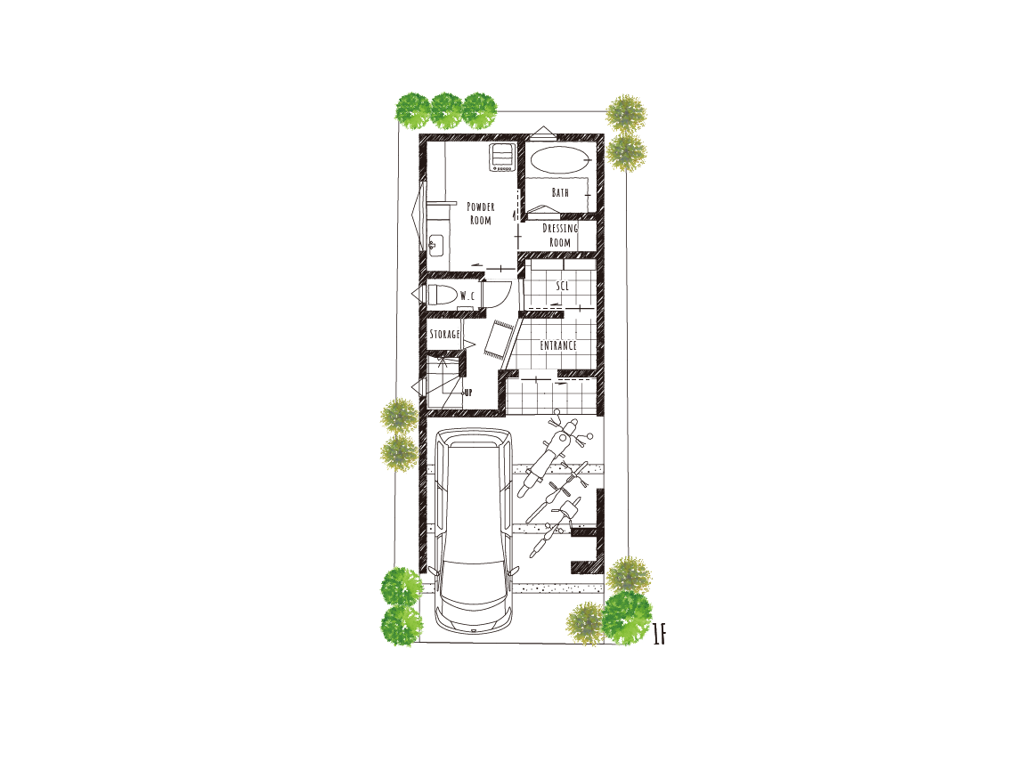 奥行きのある18帖超のLDKで、のびやかに暮らせる心地よいお家です。動線に優れたセパレートタイプのⅡ型キッチンからは、ダイニングやリビングまで見渡せ、料理をしながら家族との会話も楽しめます。隣には使い勝手の良いパントリーがあり、食材のストックやキッチン用品の収納にも便利です。リビングとダイニングの間には袖壁を設け、ゆるやかに空間をゾーニング。間接照明が落ち着いた雰囲気を演出するリビングには、程よくこもれる書斎スペースもあり、在宅ワークや読書にも集中できます。1階の洗面室は4帖超の広さを確保し、室内物干しやカウンターも備えているので、雨の日や夜遅くの洗濯もここで完結でき、家事の負担を軽減してくれます。家族みんなが心地よく過ごせる、工夫いっぱいの住まいです。